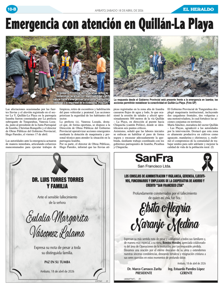 La noche del 16 de abril quedó marcada por la tragedia en Ambato, luego que un deslave provocado por las intensas lluvias terminara con la vida de una persona, cuyo […]