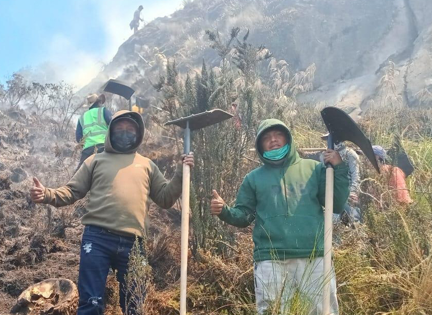 De igual manera la comunidad y los técnicos promotores y microempresarios de los Planes de Manejo de Páramos del Gobierno Provincial están colaborando con aporte voluntario, batefuegos y herramientas de todo tipo.