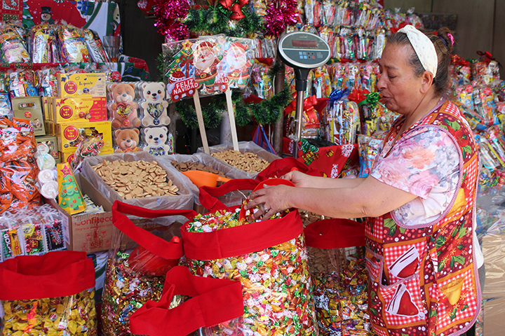 El comercio de caramelos y golosinas utilizados en las tradicionales fundas navideñas empieza a repuntar en los mercados locales. Aunque el movimiento se mantiene constante durante los primeros días de diciembre con un 20 por ciento más que en otros meses, la curva de ventas se dispara a partir del 10 o 15 de diciembre, marcando la temporada alta para los comerciantes de confites casi al 100 por ciento.