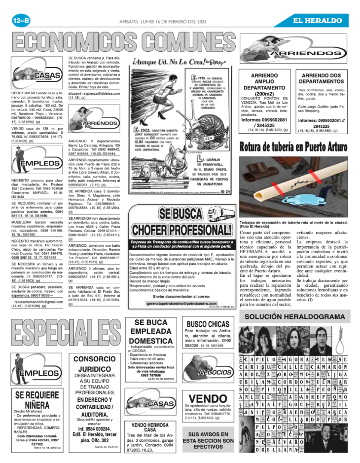 CLASIFICADOS 16 DE FEBRERO DE 2026