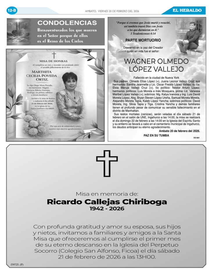 PARTES MORTUORIOS Y OBITUARIOS 20 DE FEBRERO DE 2026 20 febrero, 202620 febrero, 2026 El Heraldo Partes Mortuorios