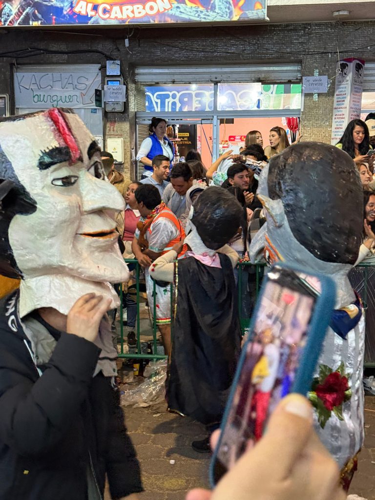 Las máscaras, protagonistas absolutas, son piezas únicas de artesanía que fusionan lo grotesco con lo solemne. En esta edición, destacan rostros rojos de facciones feroces adornados con colmillos y aros, junto a representaciones caricaturescas del mestizaje que, con narices prominentes y expresiones burlonas, rememoran la sátira indígena hacia la colonia.
