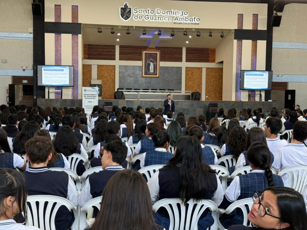 En la Unidad Educativa Santo Domingo de Guzmán, los estudiantes participaron en la jornada informativa enfocada en la prevención del uso y consumo de drogas, desarrollada en el centro de eventos de la institución.