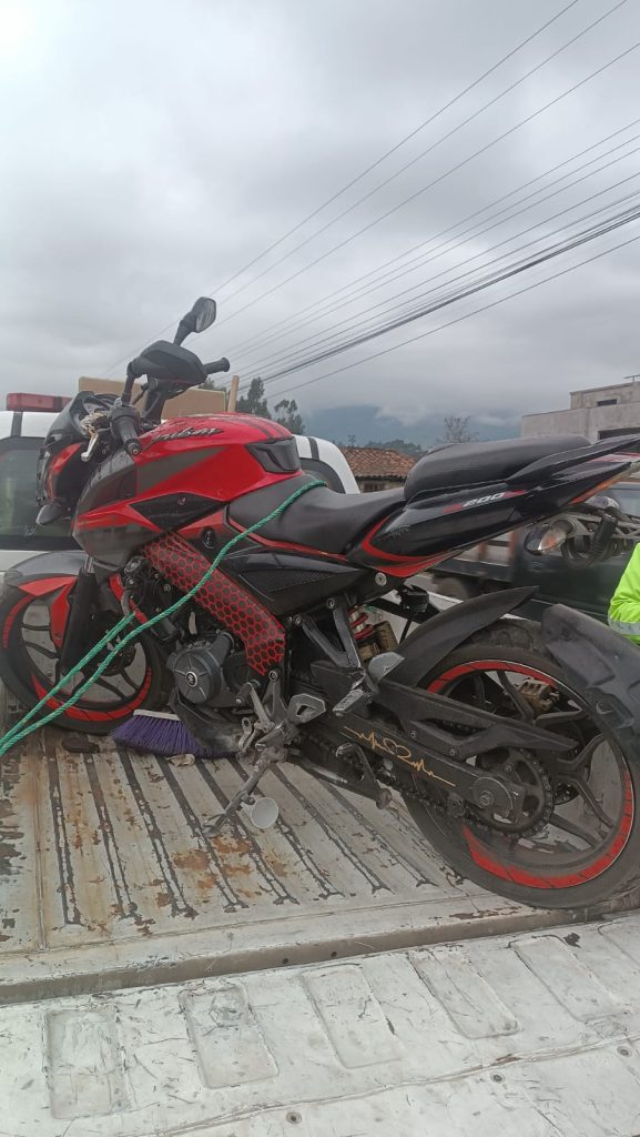 La motocicleta corresponde a una marca Bajaj, modelo Pulsar 200 NS, rojo, con placas IP447Y, la cual constaba en el sistema con alerta vigente por robo.