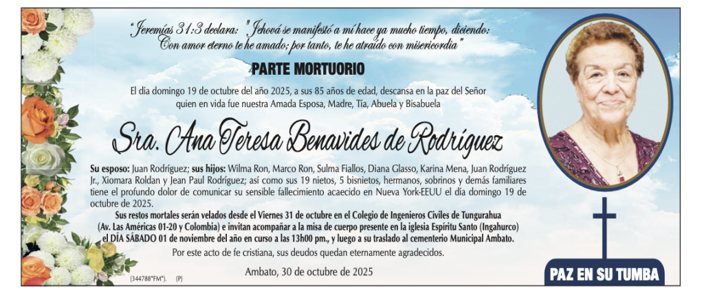 PARTES MORTUORIOS Y OBITUARIOS 31 DE OCTUBRE DE 2025 31 octubre, 20254 noviembre, 2025 El Heraldo Partes Mortuorios