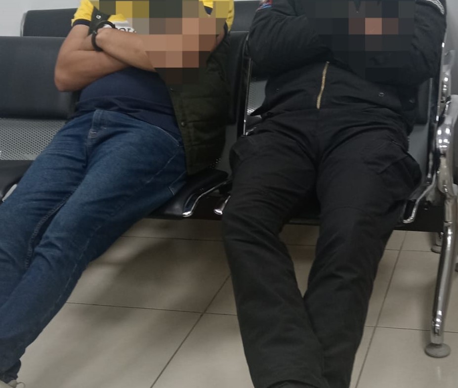 Dos hombres, uno de ellos guardia de seguridad y otro servidor policial en días libres, sentados en un área de espera tras el incidente en el Paso Lateral Sur. (Foto PN)