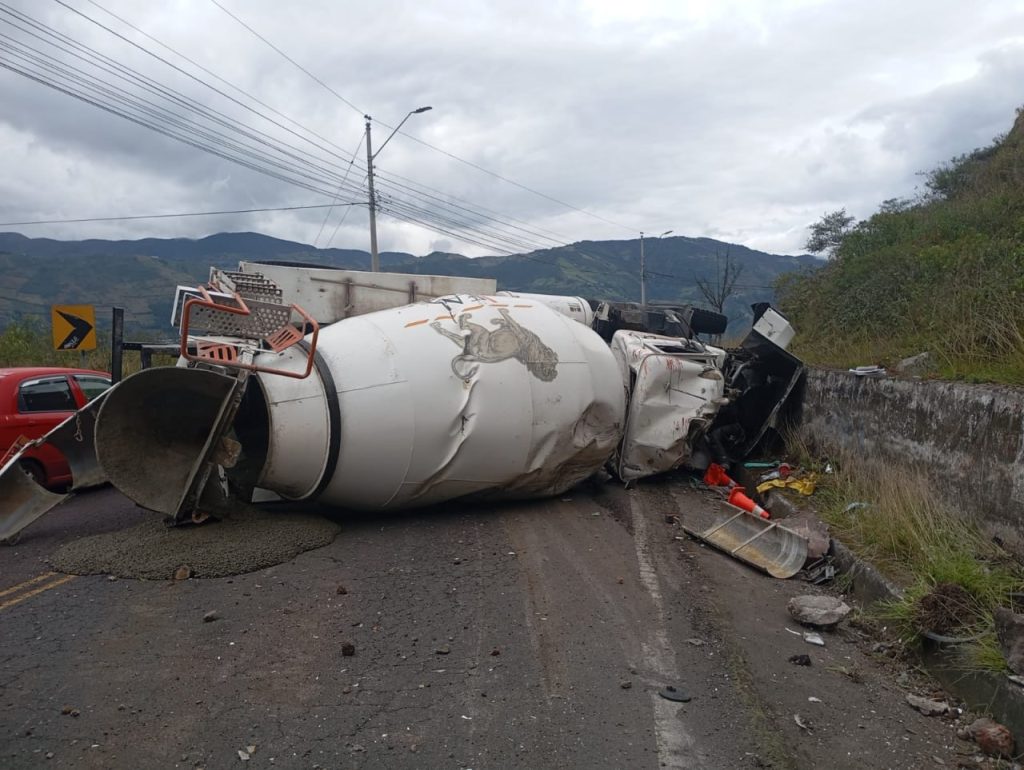 Un accidente de tránsito se registró este lunes en el sector La Librería, sobre la vía Pelileo – Baños, cuando un mixer de hormigón se volcó, según reportó un ciudadano a la Línea Única para Emergencias 9-1-1.